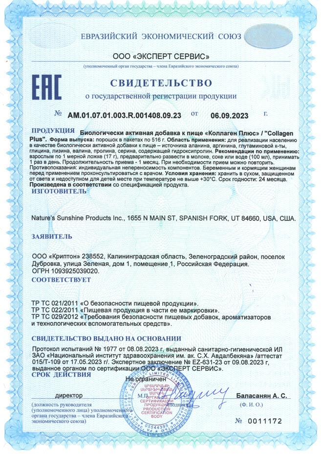 БАД к пище Коллаген Плюс является источником аланина, аргинина, глутаминовой к-ты, глицина, лизина, валина, пролина, серина, содержащей гидроксипролин.